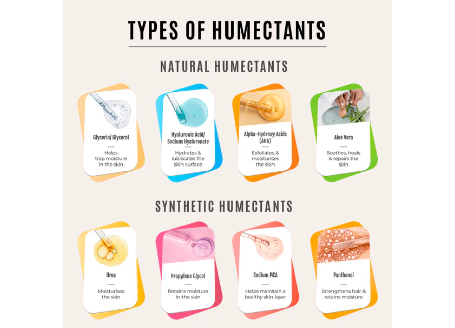 Humectants are ingredients that help retain moisture in personal care products, keeping skin and hair hydrated.