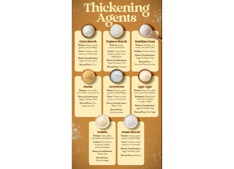 Arrowroot & Tapioca: Gluten-free options that provide a clear, smooth texture and are great for fruit pies and sauces.